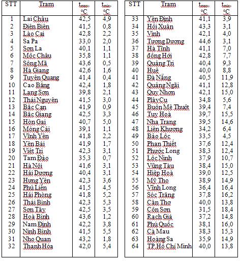 Nhiệt độ lớn nhất tmax và nhiệt độ bé nhất tmin tuyệt đối trong năm