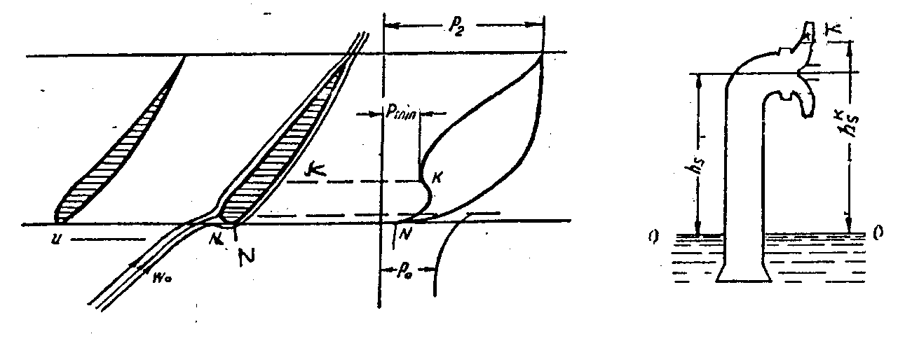 Điều kiện xảy ra khí thực tại một nơi nào đó là áp suất tại đó nhỏ hơn hoặc bằng áp suất hóa hơi. Như vậy việc nghiên cứu khí thực đưa về việc nghiên cứu những nguyên nhân dẫn tới việc làm giảm áp lực. Đo áp suất ở cánh máy bơm từ cửa vào đến cửa ra người ta nhận thấy áp suất tại điểm N ở cửa vào BXCT có áp suất nhỏ nhất. Tuy nhiên do phạm vi N rất hẹp, chất lỏng vượt qua quá nhanh, không kịp hình thành những bọt khí, do vậy khả năng phát sinh khí thực tại K sẽ nhiều hơn, tuy rằng áp suất tại K đo được lớn hơn tại A. Vì rằng áp suất tại K là nhỏ nhất đủ để phát sinh ra hiện tượng khí thực, cho nên ta coi pk = pmim ( xem Hình 5 - 3 ). Viết phương trình Becnully cho 0-0 và K ta có: