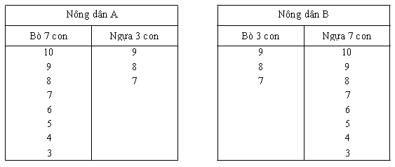 2 nông dân A và B đều có bò và ngựa. Nông dân A nhiều bò, ít ngựa, còn nông dân