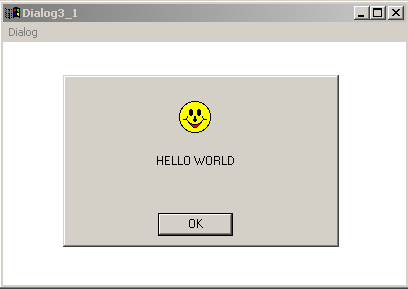 Khi hộp thoại hiện lên có xuất hiện dòng chữ "HELLO WORLD", bên trên hộp thoại có một biểu tượng của hộp thoại đó là một icon, và phía dưới hộp thoại là một nút bấm (Button) có tên là OK, khi nhấp chuột vào nút OK thì hộp thoại "HELLO WORLD" được đóng lại.