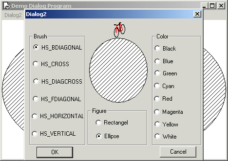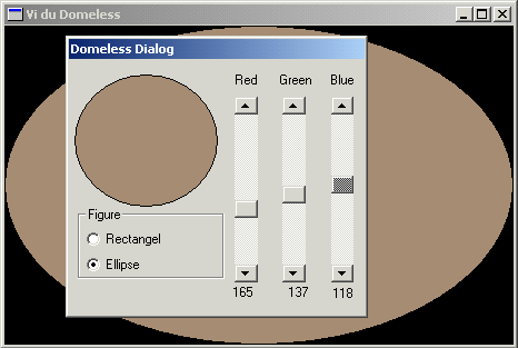 Khi dùng chuột để chọn loại hình vẽ trên radio button, loại hình vẽ được chọn sẽ vẽ cùng lúc lên control tĩnh của hộp thoại và cửa sổ chính. Dùng chuột để chọn màu tô cho hình vẽ được chọn, bằng cách rê chuột lên 3 thanh cuộn Scrollbar.