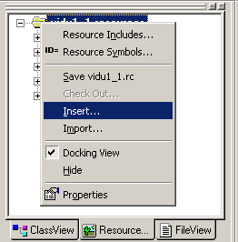 Trong ví dụ 2.1 ở trên, ta đã tạo hộp thoại bằng cách dùng các câu lệnh chứa trong file tài nguyên DIALOG1.RC. Cách làm này giúp ta hiểu cấu trúc lệnh của Windows, tuy nhiên công cự Visual C++ Developer Studio, ta có thể thiết lập một hộp thoại trực quan hơn như sau : Chọn Insert từ thực đơn Resource View để thêm một hộp thoại, màn hình được thể hiện như trong hình 2.2.