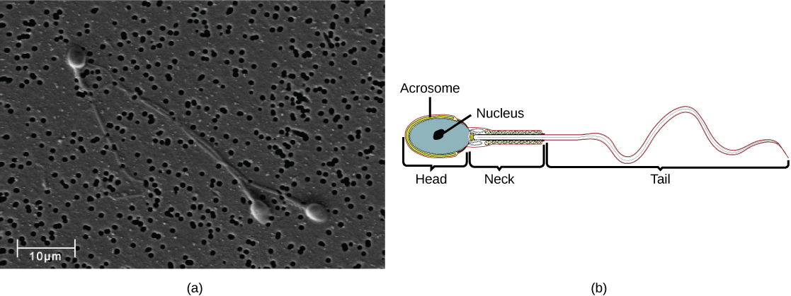 Semen is a mixture of sperm and spermatic duct secretions (about 10 percent of the total) and fluids from accessory glands that contribute most of the semen’s volume. Sperm are haploid cells, consisting of a flagellum as a tail, a neck that contains the cell’s energy-producing mitochondria, and a head that contains the genetic material. [link] shows a micrograph of human sperm as well as a diagram of the parts of the sperm. An acrosome is found at the top of the head of the sperm. This structure contains lysosomal enzymes that can digest the protective coverings that surround the egg to help the sperm penetrate and fertilize the egg. An ejaculate will contain from two to five milliliters of fluid with from 50–120 million sperm per milliliter.