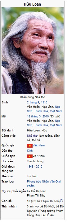 “ Hữu Loan là người ẩn tướng. Thoạt nhìn, rất khó đoán định nội lực của con người vừa có dáng tiên phong đạo cốt vừa có vẻ một tiều phu núi xanh này. Thì đúng, Hữu Loan đã từng làm công việc nặng hơn việc một tiều phu: ông thồ xe chở đá độ nhật và nuôi cả gia đình trong thời gian khổ và đau đớn... Ông xa xôi như hình bóng một tiên ông, lại gần gũi như một người nông dân vừa xong buổi cày. Thiên lý ấy lại gần trong gang tấc.”