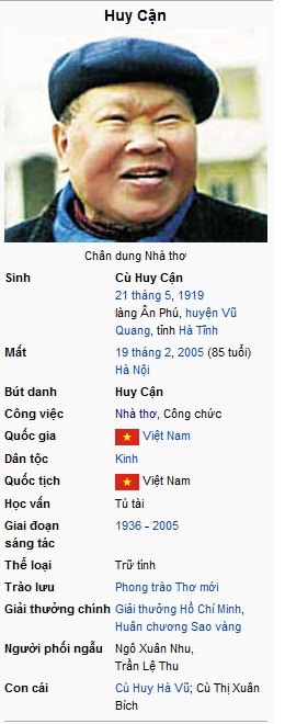 Huy Cận (tên khai sinh là Cù Huy Cận; 31 tháng 5 năm 1919 – 19 tháng 2 năm 2005), là một trong những nhà thơ xuất sắc nhất của phong trào Thơ mới. Ông là bạn tâm giao của Xuân Diệu, một nhà thơ nổi tiếng khác của Việt Nam.