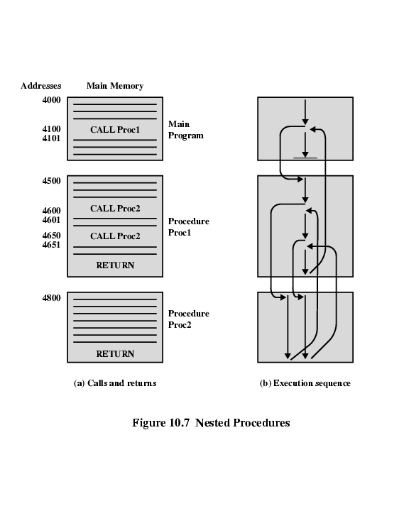 The above figure illustrates the use of procedures to construct a program. In this example, there is a main program starting at location 4000. This program includes a call to procedure PROC1, starting at location 4500. When this call instruction is encountered, the CPU suspends execution of the main program and begins execution of PROC1 by fetching the next instruction from location 4500. Within PROC1, there are two calls to PR0C2 at location 4800. In each case, the execution of PROC1 is suspended and PROC2 is executed. The RETURN statement causes the CPU to go back to the calling program and continue execution at the instruction after the corresponding CALL instruction. This behavior is illustrated in the right of this figure.