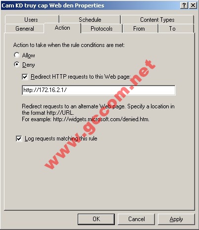 Trở lại màn hình ISA Server nhấp phải vào Rule Cam KD truy cap Web den và chọn Properties