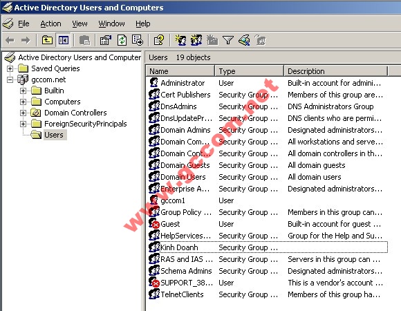 Tại máy PC02 bật Active Directory Users and Computers lên và tạo một Group là Kinh Doanh và một User là gccom1. Tiến hành Add gccom1 vào Group Kinh Doanh