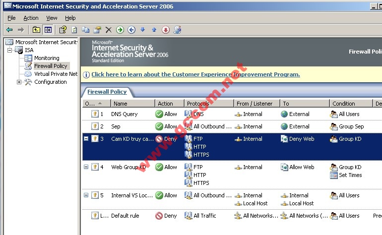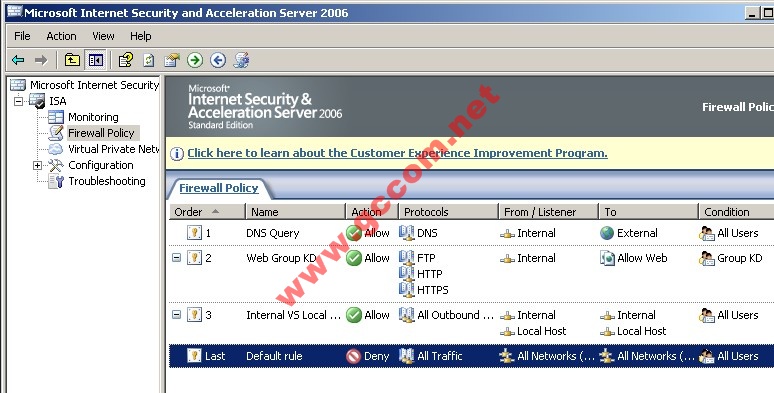 Tuy nhiên trong ISA Server các Rule nào có thuộc tính Order càng nhỏ thì được ưu tiên cao hơn hay nói cách khác các Rule nào nằm trên sẽ được ưu tiên hơn là các Rule nằm bên dưới.