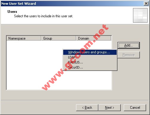 Vì tôi muốn Rule này chỉ tác động lên Group Kinh Doanh mà thôi nên trong User Sets chọn All User và Remove nó đi. Sau đó nhấp Add để thêm Group mới