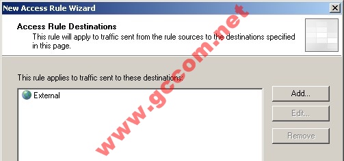 Tuy nhiên trong Access Rule Destinations ta không chọn thuộc tính là External nữa vì như thế các User có thể truy cập mọi trang Web mà vấn đề đặt ra ở đây là ta cần giới hạn lại và chỉ cho phép truy cập một số trang Web mà thôi. Nên bạn chọn Add