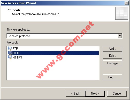 Tại cửa sổ Protocol ta chỉ mở 3 Port là Port 80,Port 443,Port 21 để truy cập các dịch vụ HTTP, HTTPS, FTP mà thôi nên ta giữ nguyên chế độ Selected protocols chọn Add