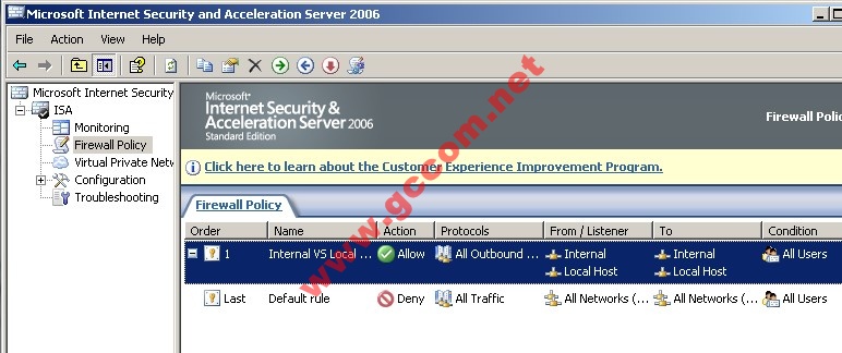 Như vậy chúng ta đã hoàn tất các bước cài đặt ISA Server và cấu hình cho tất cả các máy từ Internal Network có thể truy cập ISA Server (Local Host) bằng Firewall Client. Và như chúng đã biết sau khi cài đặt xong ISA Server lập tức ngăn cách giữa Internal Network và External Network bởi chính nó, khi đó các máy trong Internal Network không thể truy cập được ra ngoài (mạng Internet) và ngược lại. Hay nói một cách khác ISA Server đã khóa tất cả mọi Port ra vào hệ thống.