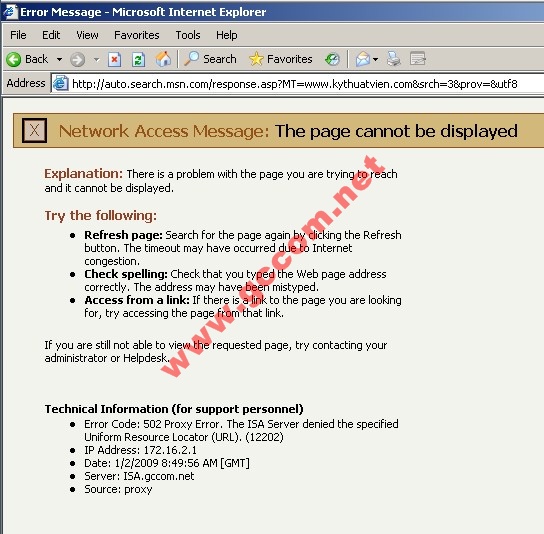 Đầu tiên tôi vào trang Web kythuatvien.com sẽ nhận thấy thông báo từ ISA là "ISA Server đã từ chối yêu cầu này", vì gccom1 thuộc Group Kinh Doanh và truy cập trang Web không nằm trong danh sách Allow Web