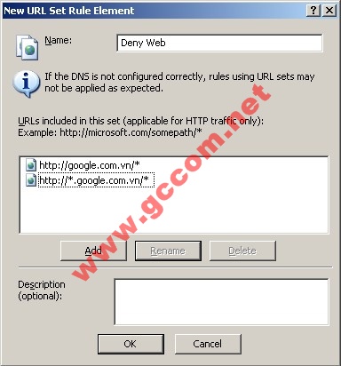 Như vậy với mỗi trang Web chúng ta cần phải nhập 2 dòng theo cú pháp trên. Trong này ví dụ tôi cho phép User có quyền truy cập 2 trang gccom.net và google.com mà thôi.