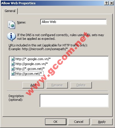 Trong cửa sổ Allow Web Properties đặt tên cho URL set này ví dụ là Allow Web