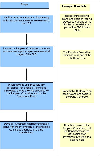 - When specific CDS products are developed, for example visions and strategies, ensure they are endorsed by the People's Committee and by the Communist Party.