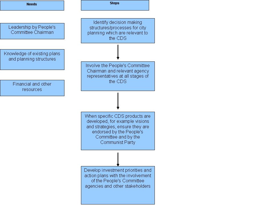 To help you develop the most appropriate implementation and integration strategies for your CDS, the following diagram outlines a framework of ‘needs’ and ‘steps’. These ‘needs’ are pre-requisites for successful integration of a CDS. They include support from the People’s Committee, knowledge of the existing institutional landscape in your city and financial and other (for example human) resources. The ‘steps’ outline a number of stages of the integration process. They will guide you through the necessary procedures to implement and integrate your CDS.
