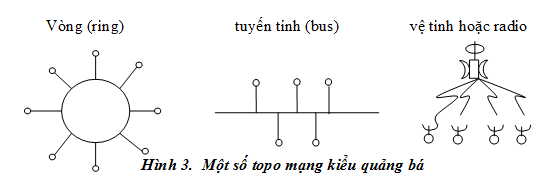 - Kiểu quảng bá: Tất cả các nút mạng dùng chung một đường truyền vật lý. Dữ liệu gửi đi từ một nút mạng có thể được tất cả các nút mạng còn lại tiếp nhận → chỉ cần chỉ ra địa chỉ đích của dữ liệu để mỗi nút kiểm tra xem có phải là gửi cho mình hay không.