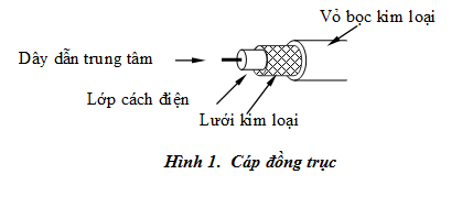 - Cáp đồng trục dùng để truyền các tín hiệu số trong mạng cục bộ hoặc làm mạng điện thoại đường dài. Cấu tạo gồm có một sợi kim loại ở trung tâm được bọc bởi một lớp cách điện và một lưới kim loại chống nhiễu. ở ngoài cùng là vỏ bọc cách điện. Sợi kim loại trung tâm và lưới kim loại làm thành hai sợi dẫn điện đồng trục