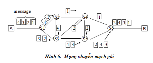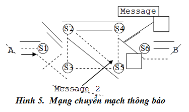 - Mỗi nút cần phải lưu trữ tạm thời để “đọc” để đọc thông tin điều khiển trên thông báo để sau đó chuyển tiếp thông báo đi. Tuỳ thuộc vào điều kiện của mạng, các thông báo khác nhau có thể truyền theo đường truyền khác nhau.