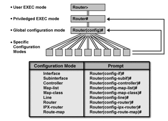 Cisco router có nhiều chế độ (mode) khi config, mỗi chế độ có đặc điểm riêng, cung cấp một số các tính năng xác dịnh để cấu hình router. Các mode của Cisco router được trình bày trong hình 2
