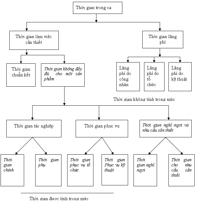 Là thời gian công nhân làm công việc tác nghiệp ra sản phẩm một cách trực tiếp hoặc gián tiếp và thời gian nghỉ sau thời gian làm việc để phục hồi lại sức khoẻ có thể tiếp tục làm việc. Thời gian trong định mức bao gồm các loại thời gian sau: