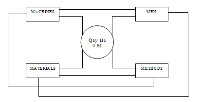 Sản phẩm là kết quả của một quá trình biến đổi, do vậy chất lượng sản phẩm cũng là kết quả của quá trình. Mà một quá trình sản xuất lại gồm nhiều các công đoạn khác nhau. Trong mỗi công đoạn đó nó đều chịu sự chi phối của các nhân tố cơ bản như: Con người (Men); phương pháp tổ chức quản lý (Methods); thiết bị công nghệ(machines); nguyên, nhiên vật liệu(materials)- đó là điều ta không thể phủ nhận. Người ta còn gọi đó là “ quy tắc 4M”.