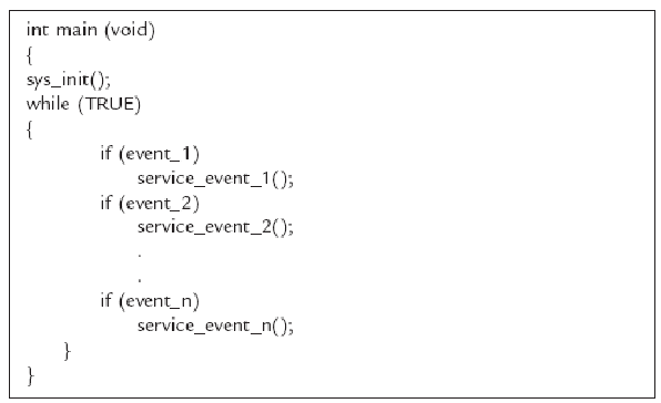Hãy xem đoạn code trong hình 8.4. Chương trình được bắt đầu bằng một vài cài đặt ban đầu cho hệ thống rồi truy cập vào trong một vòng lặp vô hạn, trong đó, các sự kiện mà hệ thống có thể phản ứng lại được kiểm tra. Khi có một sự kiện xảy ra, dịch vụ phản ứng lại sự kiện đó được kích hoạt.