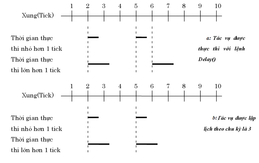 Có rất nhiều tác vụ mà công việc của nó chỉ là thức dậy theo chu kỳ, làm một vài công việc nào đó và quay trở lại ngủ tiếp. Có một vài phương pháp để thực hiện các tác vụ kiểu này như trên hình 8.2. Trong tất cả các hệ điều hành, chúng ta đều có thể tìm thấy một lệnh gọi là hàm trễ Delay(), hoặc là một vài hàm có chức năng tương tự. Hàm này làm cho tác vụ bị khoá trong một thời gian xác định cho trước, thông thường thời gian này được biểu diễn bằng xung đồng hồ (clock tick). Hình 8.2a cho ta thấy việc thực hiện một tác vụ khi ta sử dụng lệnh Delay() đối với tác vụ có tính chu kỳ đó. Trong trường hợp này, khoảng thời gian trễ là 3 clock tick. Hoạt động của hệ thống phụ thuộc vào thời gian thực thi của tác vụ. Nếu thời gian thực hiện nhỏ hơn 1 tick thì tác vụ sẽ thức dậy sau mỗi 3 tick như mong muốn. Tuy nhiên, nếu tác vụ hoạt động quá 1 tick, khi đó, sau khi tác vụ gọi lệnh Delay(), nó vẫn sẽ bị khoá trong 3 clock tick. Thế nhưng, trong ví dụ này, tác vụ thực tế là sẽ thức dậy sau mỗi 4 xung clock tick. Đó không phải là điều chúng ta mong muốn.