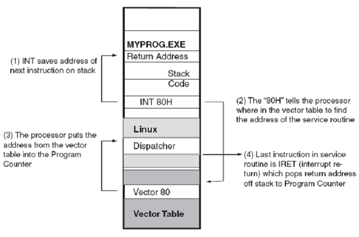 Lệnh INT cũng tương tự như lệnh gọi chương trình con CALL nhưng có đôi chút khác biệt: trong khi địa chỉ đích của lệnh CALL được nhúng vào trong câu lệnh đó thì với INT, ta không cần quan tâm đến địa chỉ của ISR. Địa chỉ của nó nầm trong bảng véctơ ngắt. Đây là một điểm thuận lợi cho việc truyền thông giữa chương trình được biên dịch và chương trình được tải, ví dụ như chương trình ứng dụng và hệ điều hành.