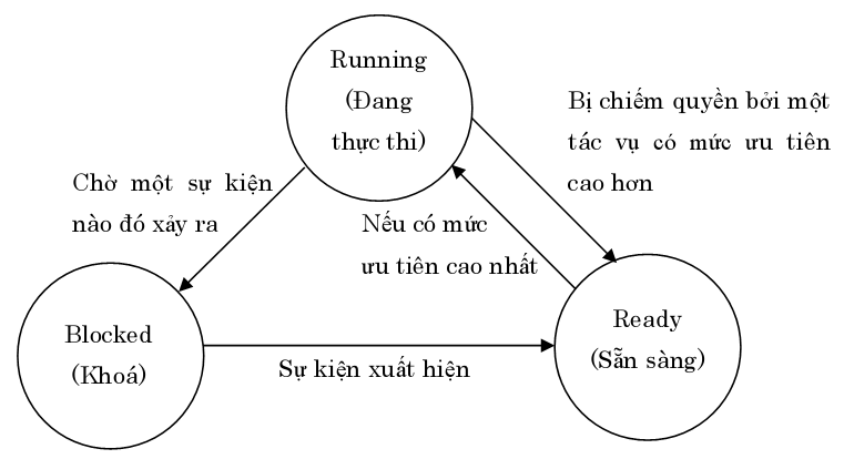 Đang thực thi (Running): chỉ có duy nhất một tác vụ là được nằm trong trạng thái này. Một tác vụ có thể tự động chuyển từ trạng thái Đang thực thi sang trạng thái Khoá (Blocked) bằng việc chờ đợi một sự kiện xảy ra. Trong một hệ thống có sự chiếm quyền thực thi (chúng ta sẽ đề cập đến nó sau), bộ lập lịch có thể bắt một tác vụ đang ở trạng thái Đang thực thi xuống trạng thái Sẵn sàng (Ready) nếu có một tác vụ với mức ưu tiên cao hơn chuyển đến trạng thái Sẵn sàng. Chúng ta gọi nó là sựchiếm quyền thực thi (preemption).
