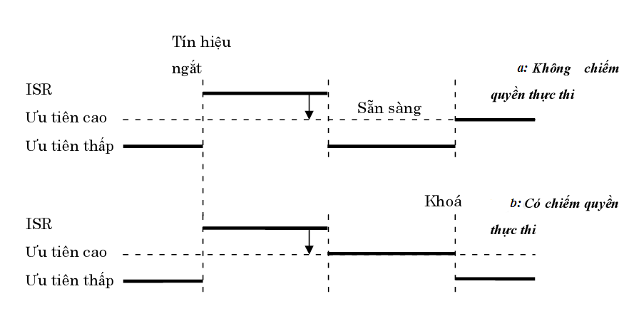 Hình 8.3 b ứng với trường hợp của hệ thống có tính chiếm quyền ưu tiên. Điểm khác biệt ở đây là bộ lập lịch được gọi đến ở cuối chương trình con dịch vụ ngắt. Bộ lập lịch xác định tác vụ có mức ưu tiên cao đang ở trạng thái Sẵn sàng và chuyển nó lên trạng thái thực thi. Do đó, tác vụ với mức ưu tiên thấp đã bị chiếm quyền thực thi. Một hệ thống không có tính chiếm quyền thực thi muốn rằng tất cả các tác vụ phải là “những công dân tốt” bằng cách tự nguyện trao trả bộ xử lý cho các tác vụ khác để chắc chắn một điều: các tác vụ đều có cơ hội để sử dụng bộ xử lý. Các thế hệ Windows trước kia đều là dạng này. Linux thì khác, nó là một hệ điều hành có tính chiếm quyền thực thi mặc dù các bản Linux chuẩn không quan tâm đến vấn đề thời gian thực bởi trong một thời gian dài, vấn đề chiếm quyền thực thi không được đề cập.