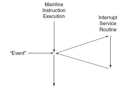Phương pháp tiếp cận thứ 2 là ngắt (Interrupt). Rất hữu dụng và cũng gây không ít khó khăn cho người lập trình. Ý tưởng của ngắt: sự xuất hiện của một sự kiện có thể “ngắt” tiến trình thực hiện của chương trình, “nhồi” thêm và thực hiện một tiến trình khác vào như hình 8.5. Khi tiến trình nhồi thêm được thực hiện xong, chương trình chính lại được thực hiện tiếp từ thời điểm bị ngắt. Tiến trình của sự kiện ngắt được thực hiện ngay lập tức mà không phải quan tâm đến chương trình chính. Những tiến trình như thế người ta gọi là “chương trình con dịch vụ ngắt” (Interrupt Service Routine) viết tắt ISR.