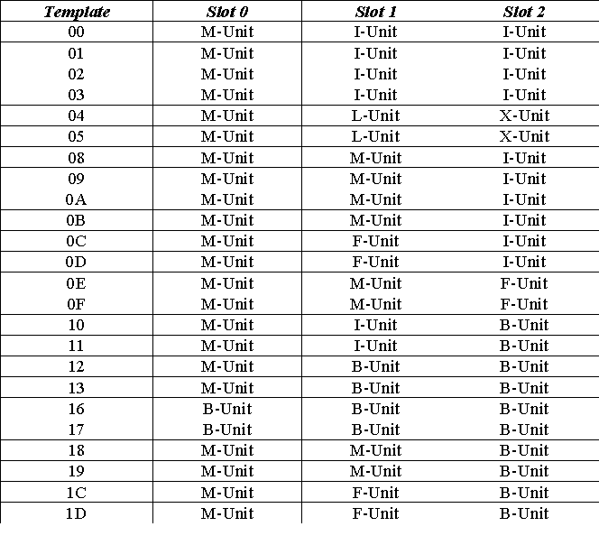 Kiến trúc IA-64 định nghĩa một gói (buldle) 128 bit chứa ba lệnh (mỗi lệnh dài 41 bit) và một trường mẫu (template field) 5 bit. Bộ xử lý có thể lấy một hay nhiều gói lệnh thi hành cùng lúc. Trường mẫu (template field) này chứa các thông tin chỉ ra các lệnh có thể thực hiện song song (Bảng III.1). Các lệnh trong một bó có thể là các lệnh độc lập nhau. Bộ biên dịch sẽ sắp xếp lại các lệnh trong các gói lệnh kề nhau theo một thứ tự để các lệnh có thể được thực hiện song song
