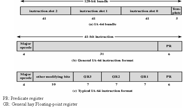 Hình III.12a chỉ ra định dạng lệnh trong kiến trúc IA-64. Hình III.12b mô tả dạng tổng quát của một lệnh trong gói lệnh. Trong một lệnh, mã lệnh chỉ có 4 bit chỉ ra 16 khả năng có thể để thi thi hành một lệnh và 6 bit chỉ ra thanh ghi thuộc tính được dùng với lệnh. Tuy nhiên, các mã tác vụ này còn tuỳ thuộc vào vị trí của lệnh bên trong gói lệnh, vì vậy khả năng thi hành của lệnh nhiều hơn số mã tác vụ được chỉ ra. Hình III.12c mô tả chi tiết các trường trong một lệnh (41 bit)
