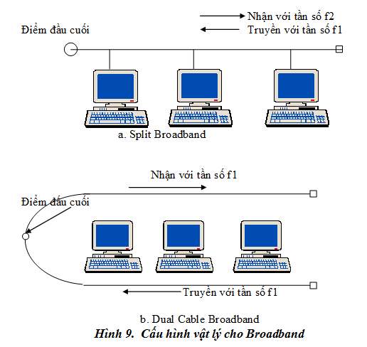 - Phương thức truyền theo dải rộng chia dải thông (tần số) của đường truyền thành nhiều dải tần con (kênh), mỗi dải tần con đó cung cấp một kênh truyền dữ liệu tách biệt nhờ sử dụng một cặp modem đặc biệt. Phương thức này vốn là một phương tiện truyền một chiều: các tín hiệu đưa vào đường truyền chỉ có thể truyền đi theo một hướng → không cài đặt được các bộ khuyếch đại để chuyển tín hiệu của một tần số theo cả hai chiều. Vì thế xảy ra tình trạng chỉ có trạm nằm dưới trạm truyền là có thể nhận được tín hiệu. Vậy làm thế nào để có hai đường dẫn dữ liệu trên mạng. Điểm gặp nhau của hai đường dẫn đó gọi là điểm đầu cuối. Ví dụ, trong topo dạng bus thì điểm đầu cuối đơn giản chính là đầu mút của bus (terminator), còn với topo dạng cây (tree) thì chính là gốc của cây (root). Các trạm khi truyền đều truyền về hướng điểm đầu cuối (gọi là đường dẫn về), sau đó các tín hiệu nhận được ở điểm đầu cuối sẽ truyền theo đường dẫn thứ hai xuất phát từ điểm đầu cuối (gọi là đường dẫn đi). Tất cả các trạm đều nhận dữ liệu trên đường dẫn đi. Để cài đặt đường dẫn về và đi, có thể sử dụng cấu hình vật lý sau: