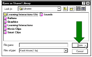 2. Chọn thư viện chia sẻ mà bạn muốn mở và nhấp chuột vào nút Open. Thư viện Shared Library mở một cửa sổ Library trong đoạn phim hiện hành. Các lệnh và các nút trong trình đơn Options tại cửa sổ Shared Library bị mờ đi cho biết những tùy chọn đó chưa được dùng đến.