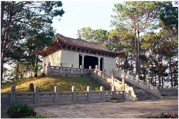 Lăng xây dựng trên một ngọn đồi cao - lăng tựa đóa hoa sen đang nở. Cổng lăng là trụ biểu gồm 4 trụ thẳng đứng trang trí hoa sen và chó ngao và đề tự 2 cặp câu đối do chính Nam Phương Hoàng Hậu đề tự . Nội dung hai cặp câu đối như sau: