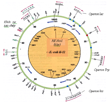 Sau đây là bản đồ di truyền liên kết gen vòng tròn của nhiễm sắc thể ở E. coli dòng K12 (hình 20.23). Bộ gen của E. coli đã được giải ký tự chuỗi (sequencing) năm 1997, nó gồm 4.639.221 bp (cặp bazơ) với khỏang 4288 ORF (khung đọc mở). Vòng ngoài cùng ghi ký hiệu một số gen, mà mặt trong các số từ 0 đến 100 chỉ vị trí tính theo số phút gen được chuyển qua. Các số ở vòng trong cùng chỉ số kilo cặp bazơ (kbp) tại các điểm nhận biết (recognition sites) của enzym cắt hạn chế (RE – restriction endonucleaz) có tên Not 1. Các mũi tên chỉ điểm khởi sự của các dòng Hfr.