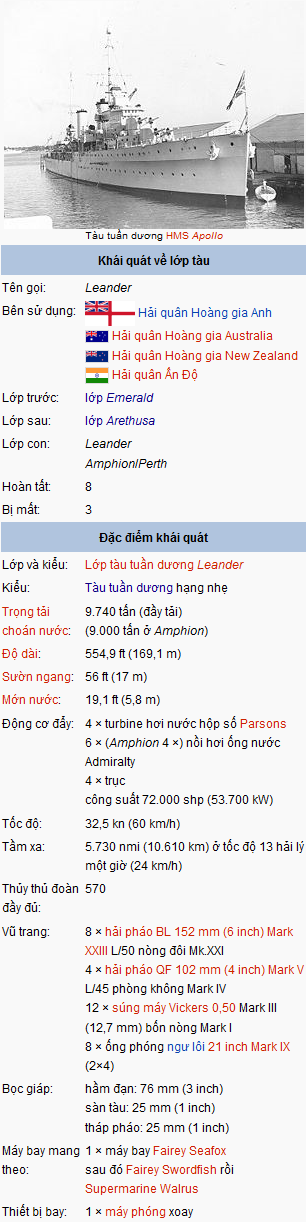 Lớp Leander chịu ảnh hưởng bởi thiết kế của lớp tàu tuần dương hạng nặng York, và được dự định để thực hiện tốt hơn vai trò bảo vệ các tuyến đường thương mại hàng hải. Những chiếc lớp Leander tải trọng 7.000-7.200 tấn được trang bị tám hải pháo BL 152 mm (6 inch) Mark XXIII trên những tháp pháo đôi, hai phía trước và hai phía sau. Dàn pháo hạng hai bao gồm bốn khẩu hải pháo QF 102 mm (4 inch) Mark V L/45 phòng không Mark IV, sau này được thay thế bởi tám khẩu QF 4 inch Mark XVI trên các bệ nòng đôi. Vũ khí phòng không bao gồm mười hai súng máy Vickers 0,5 inch (13 mm) trên ba bệ bốn nòng. Chúng cũng được trang bị một bộ bốn ống phóng ngư lôi 21 inch (530 mm) mỗi bên mạn tàu, và được thiết kế để có thể mang hai thủy phi cơ Fairey Seafox phóng lên bằng máy phóng.