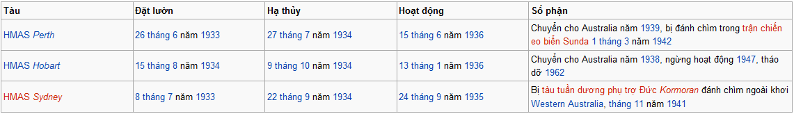 Ban đầu có tên là HMS Phaeton, HMAS Sydney được Hải quân Hoàng gia Australia sở hữu và đổi tên trước khi hạ thủy; và nó được đưa ra hoạt động vào năm 1935. Hai chiếc khác, HMS Apollo và HMS Amphion, hoàn tất năm 1936 và đã phục vụ cho Hải quân Hoàng gia ít lâu trước khi chuyển cho Australia trong các năm 1938-1939, và được đổi tên tương ứng thành HMAS Hobart và HMAS Perth. Được sử dụng trong nhiều chiến dịch khác nhau suốt Địa Trung Hải, Ấn Độ Dương và Thái Bình Dương, Sydney bị mất trong cuộc đấu pháo tay đôi với tàu tuần dương phụ trợ Đức Kormoran ngoài khơi Western Australia vào cuối năm 1941 với tổn thất nhân mạng toàn bộ con tàu, còn Perth bị mất trong trận chiến eo biển Sunda vào đầu năm 1942, chỉ còn lại Hobart sống sót qua cuộc chiến.