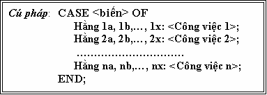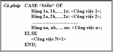 Ý nghĩa: Trước hết kiểm tra giá trị của biến có bằng một trong các hằng 1a, 1b,…, 1x hay không. Nếu đúng thì thực hiện công việc 1, rồi kết thúc lệnh (thực hiện tiếp các lệnh sau END; nếu có). Nếu không, thì kiểm tra giá trị của biến có bằng một trong các hằng 2a, 2b,…, 2x hay không. Nếu đúng thì thực hiện công việc 2, rồi kết thúc lệnh (thực hiện tiếp các lệnh sau END). Nếu không thì cứ tiếp tục kiểm tra như vậy. Nếu giá trị của biến không bằng bất cứ hằng nào từ 1a đến nx thì câu lệnh CASE kết thúc mà không làm gì cả.