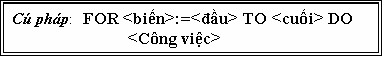Chú ý: Biến sau từ khoá FOR phải là biến đếm được và giá trị đầu phải <= giá trị cuối. Trong các lệnh của công việc không nên có các lệnh làm thay đổi giá trị của biến đếm. Vòng lặp kết thúc, giá trị biến là giá trị cuối.