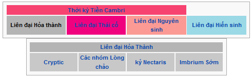 Do có quá ít dấu vết địa chất của thời kỳ này còn tồn tại trên Trái Đất, nên liên đại này không có các đơn vị phân chia nhỏ hơn một cách chính thức. Tuy nhiên, một vài đơn vị phân chia chính của niên đại địa chất Mặt Trăng đã diễn ra trong liên đại Hỏa Thành, và vì thế có thể áp dụng một cách không chính thức các đơn vị niên đại địa chất này để trỏ tới cùng thời kỳ đó trên Trái Đất.