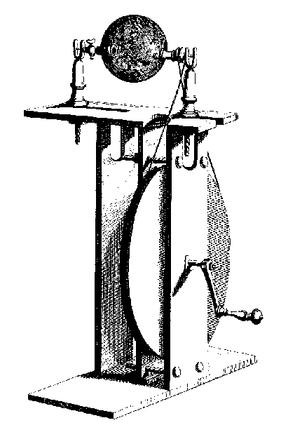 Chiếc máy điện đầu tiên được chế tạo bởi Otto von Guericke (người Đức, 1602-1686). Đó là một quả cầu sunphua (“kích thước của đứa trẻ sơ sinh”) với một chiếc rìu sắt gắn với một khung gỗ, như hình vẽ. khi quả cầu quay và bị cọ xát, nó tạo ra tĩnh điện (von Guericke, 1672). Chiếc máy điện thứ hai được phát minh vào năm 1704 bởi Francis Hauksbee the Elder (người Anh, 1666-1713). Nó là một quả cầu thủy tinh được quay bởi một bánh xe. Khi quay thủy tinh bị cọ xát và nó sinh ra điện liên tục (Hauskbee, 1709). Nó đề cập tới rằng Hauskbee cũng thí nghiệm với việc rút không khí khỏi quả cầu thủy tinh bằng một bơm không khí và có thể tạo ra một ánh sáng chói, và vì vậy dự đoán việc phát hiện ra tia catốt, tia x, electron.