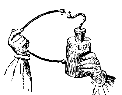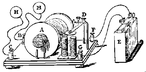 Năm 1872, T. Green miêu tả phương pháp hồi hô hấp và nhịp đập của tim, một phương pháp làm tỉnh lại các bệnh nhân phẫu thuật bị gây mê bởi cloroform, và bất tỉnh bởi hiệu ứng suy giảm hô hấp và nhịp tim. Sử dụng một nguồn tới 200 pin để tạo ra khoảng 300 V, ông cung cấp điện áp này cho bệnh nhân ở giữa cổ và sườn dưới bên trái. Đã có tài liệu rằng T. Green đã sử dụng phương pháp này thành công trên năm hoặc bảy bệnh nhân bị dừng thở đột ngột và không có mạch (Green, 1872). Micheal Faraday phát minh ra cuộn dẫn năm 1831 đã mở đầu cho thời đại dòng điện cảm ứng trong điện y học (Faraday, 1834). Tuy nhiên, nó được Emil Heinrich du Bois-Reymond (người Đức, 1818-1896), là người mà năm 1846 đã giới thiệu cuộn dẫn trong ứng dụng y tế. Nó được gọi là kích thích Faraday. Một cuộn dẫn với một búa đập được chỉ ra ở hình vẽ dưới.