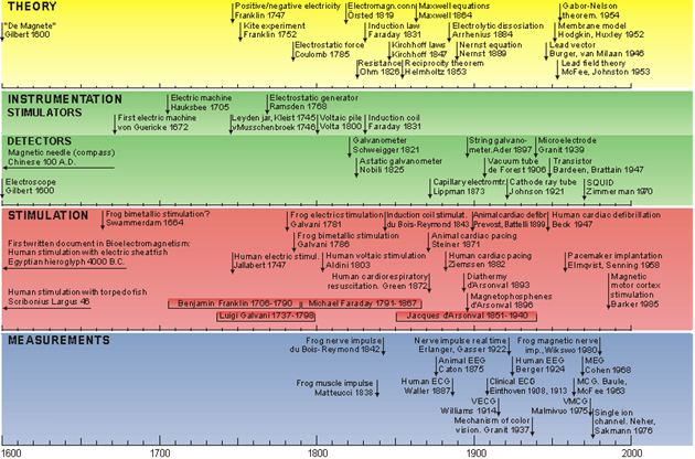 Lịch sử của điện từ sinh học được tổng kết theo thứ tự thời gian như hình 1.20. Các sự kiện lịch sử được chia thành bốn nhóm : lý thuyết, trang thiết bị, sự kích thích, và đo lường. Hình này có thể xem như là một tổng quan hữu ích cho người đọc và giúp họ nhận ra một đóng góp kế thừa từ một đóng góp trước đó và sự phát triển của toàn bộ môn học này như thế nào. Từ hình này chúng ta có thể tóm tắt theo những ý sau đây.