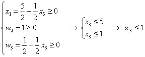 Thực hiện tương tự như trên, người ta tăng x3 từ bằng 0 lên một giá trị dương cho phép và đồng thời vẫn giữ x2 và w1 bằng 0 thì giá trị của hàm của hàm mục tiêu sẽ giảm xuống. Khi đó các biến ở vế trái của bài toán (II) sẽ bị thay đổi theo nhưng phải thoả ≥ 0 . Ta được :