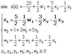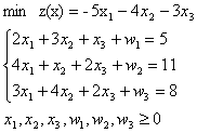 Đưa bài toán về dạng chính tắc bằng cách đưa vào các biến phụ w1, w2, w3 ≥ 0 ( làm cho các ràng buộc bất đẳng thức thành đẳng thức ) . Ta được :